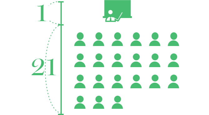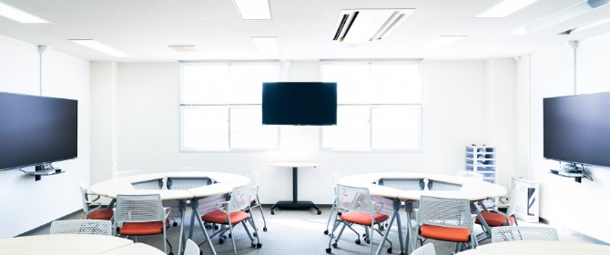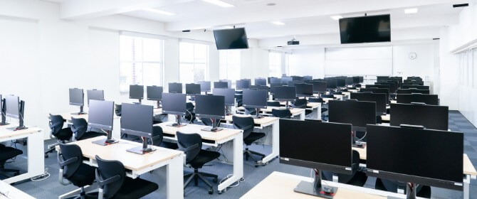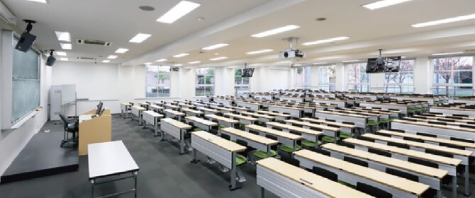 プロジェクターをはじめとしたICT機器や音響・映像システムを完備。大人数の講義の際もきめ細かな指導が可能になっています。