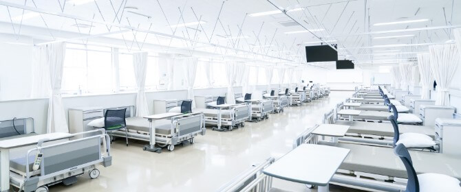 看護学部生が1年次から使用する実習室。実際の病棟と同様のベッドなどが完備され、実践に基づいたスキルを身につけることができます。十分な数のベッドが用意されており、豊富な学びの機会が得られます。